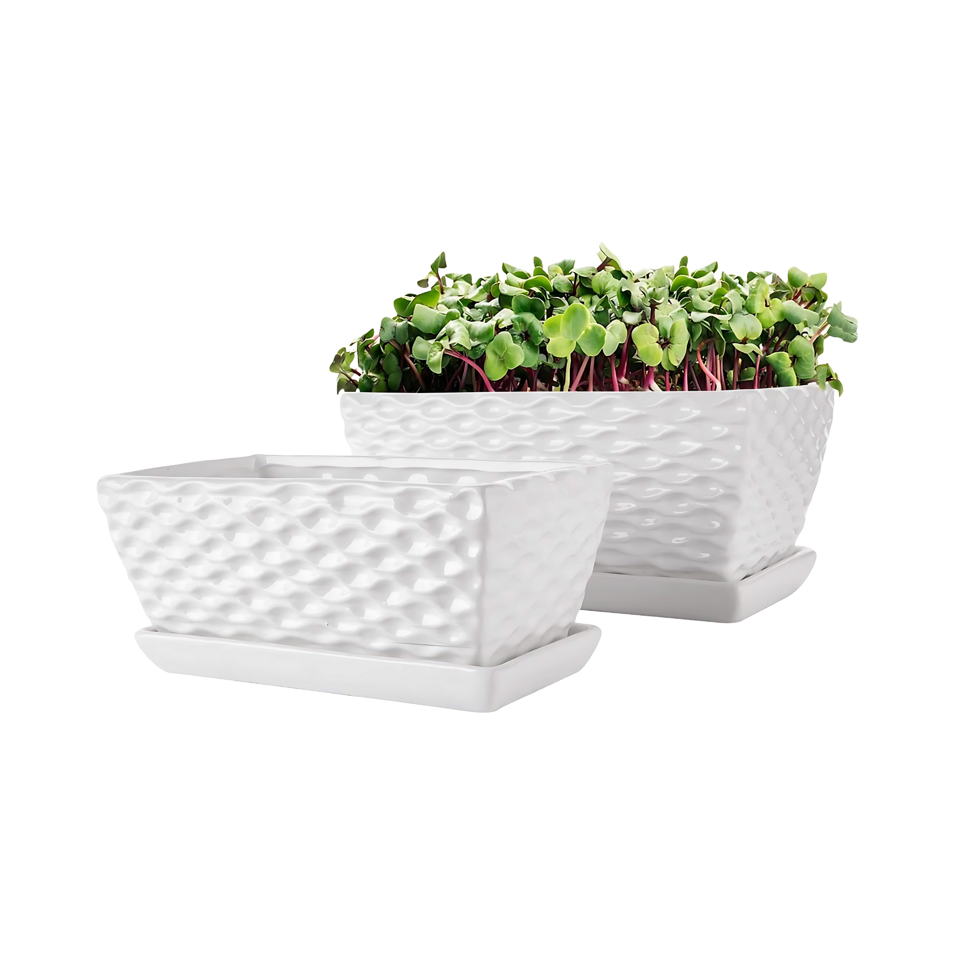 These white ceramic rectangular planter pots offer a sleek, modern design ideal for showcasing succulents and small plants. Each pot includes a matching saucer to catch excess water, helping protect surfaces from moisture damage. The durable ceramic material provides stability and complements contemporary interiors, making these planters both functional and stylish additions to your indoor gardening setup.
